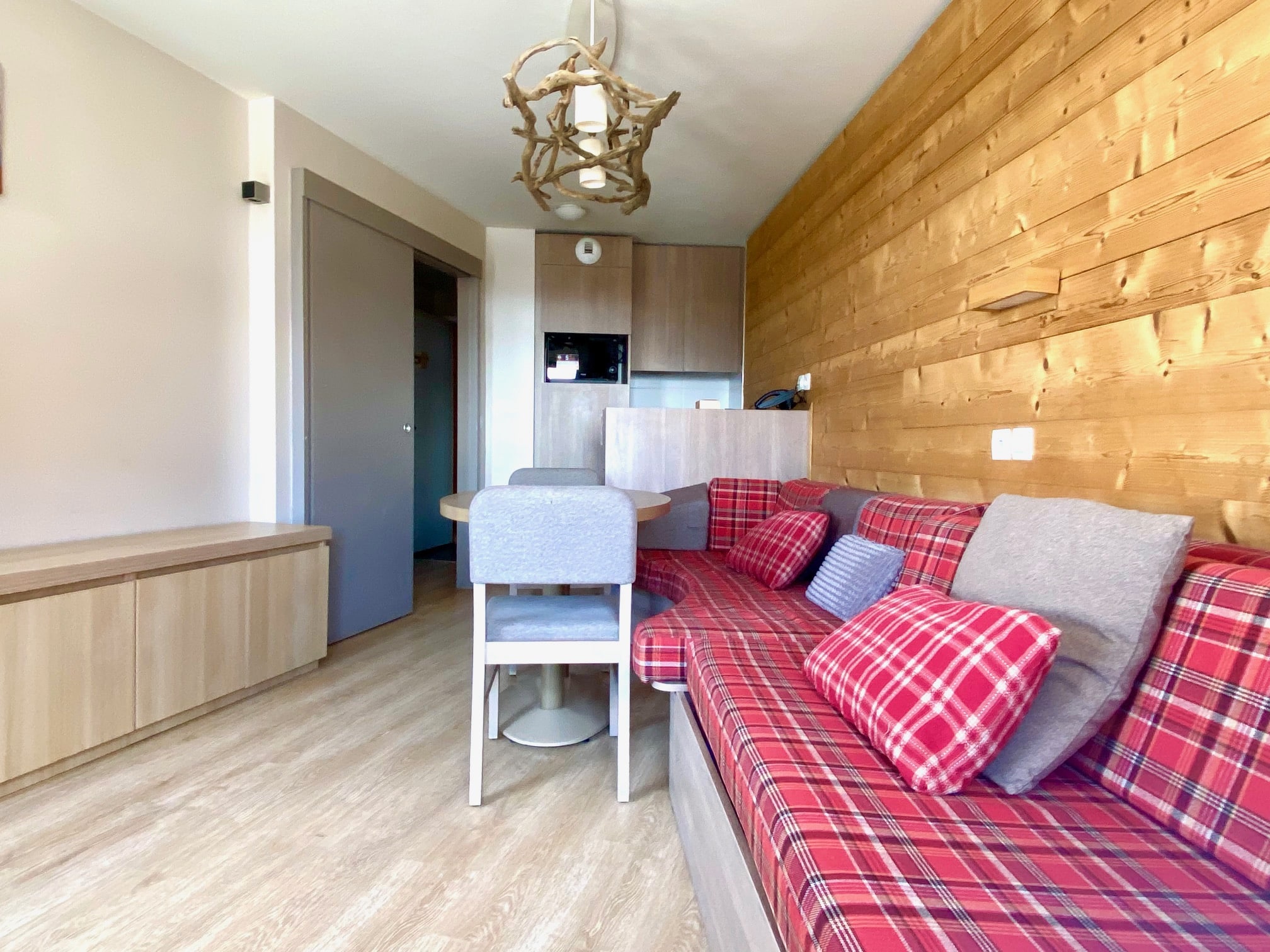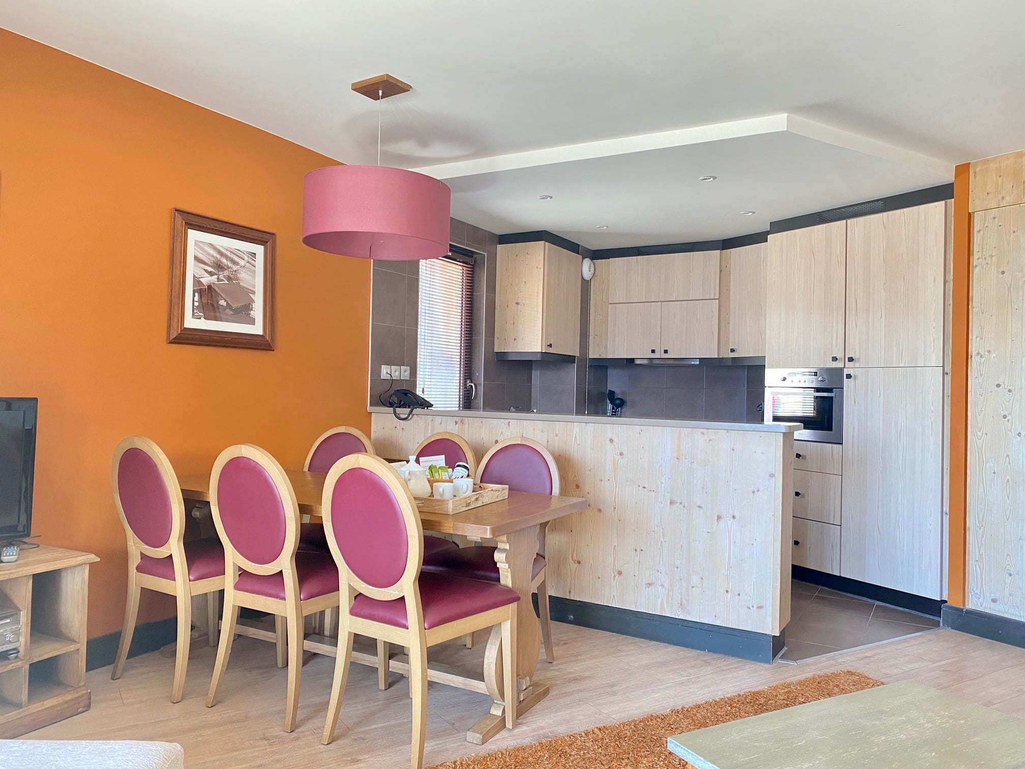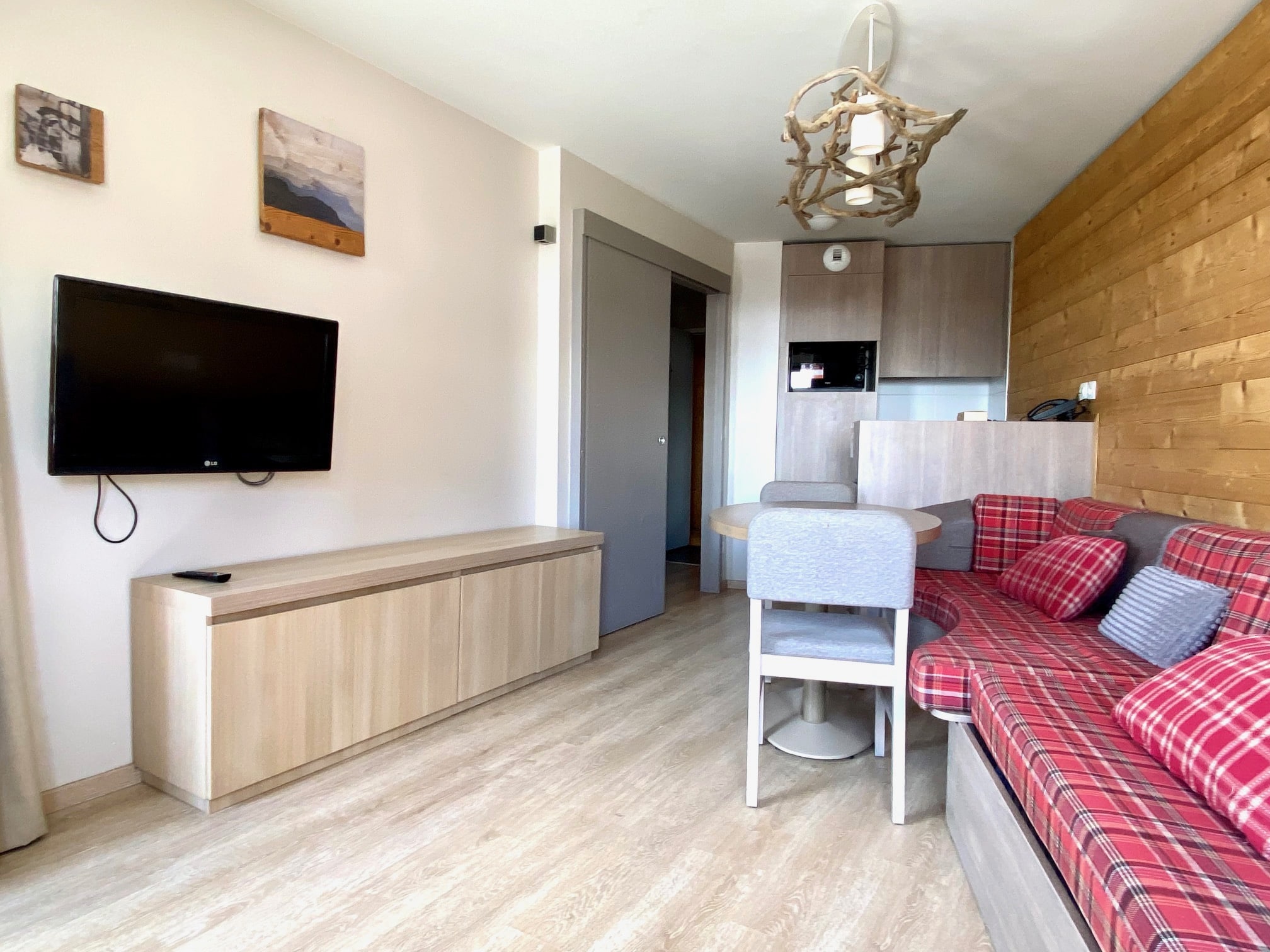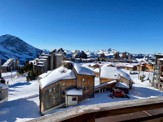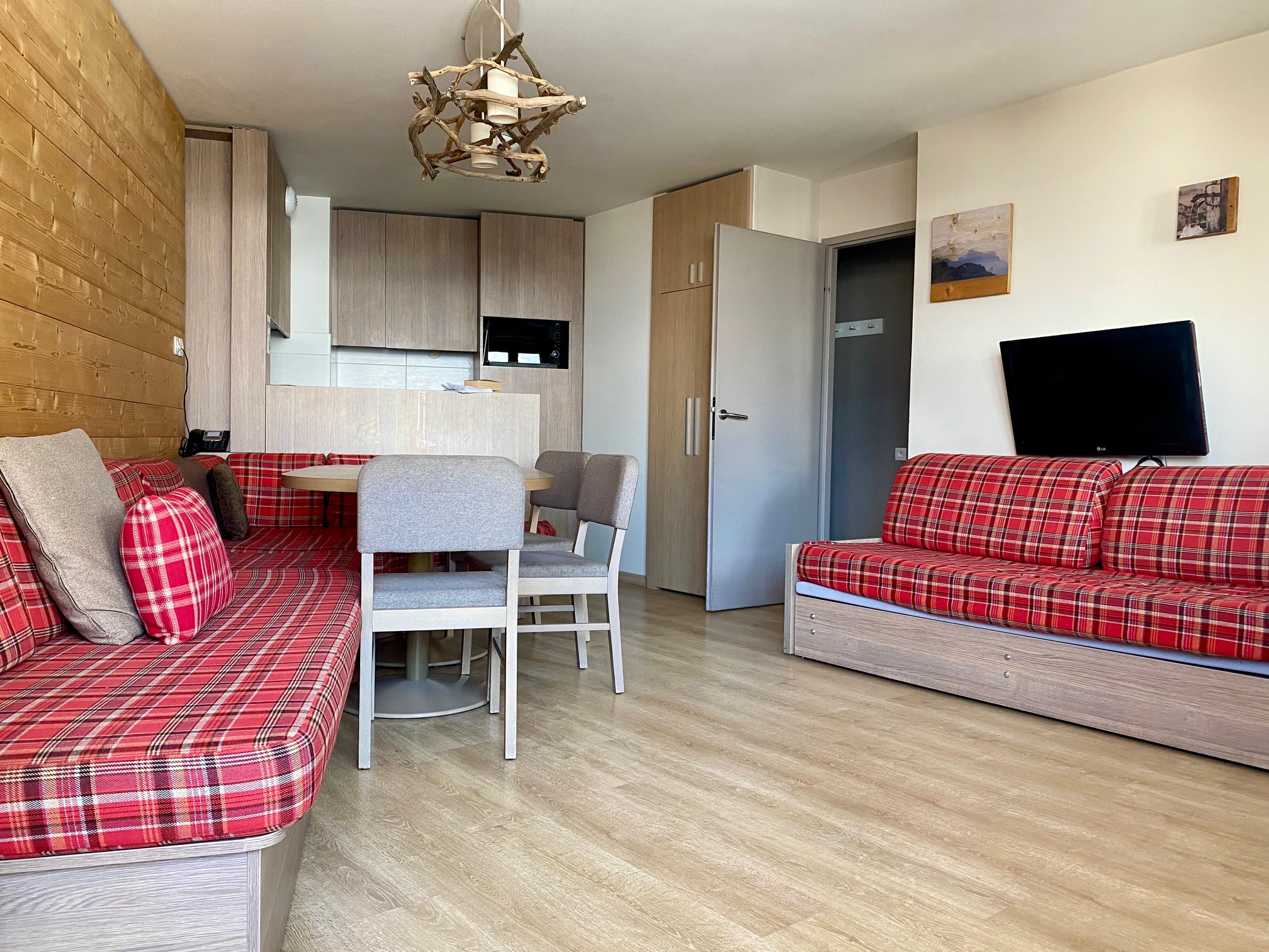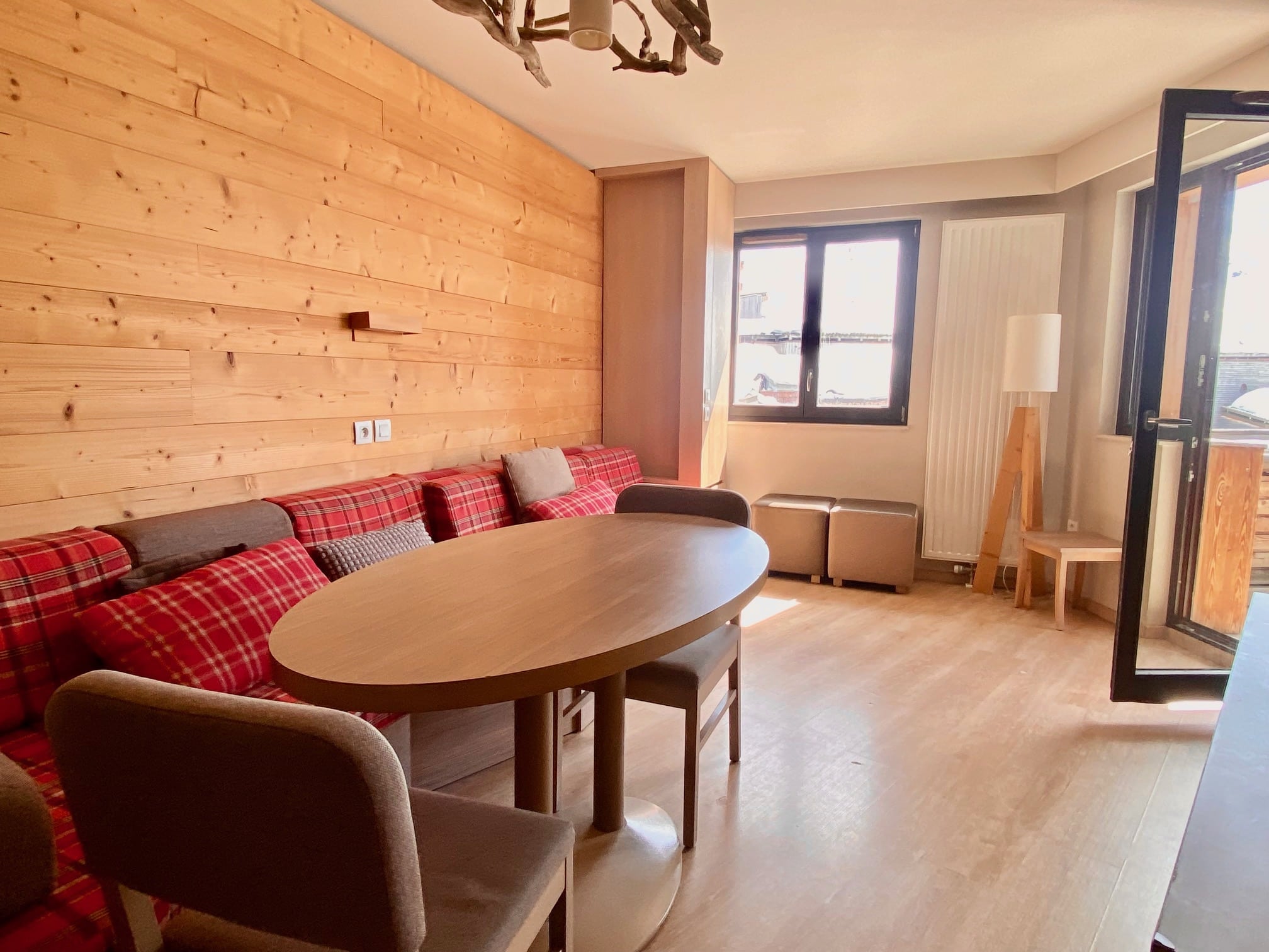 Résidence L’Electra . 2 pièces situé au dernier étage , vous profitez d’une vue panoramique sur la station et d’une belle luminosité grâce à sa hauteur sous plafond . appartement très bien agencé et idéal pour des vacances à la montagne : entrée avec chambre , une salle de bains et toilettes séparés , puis la pièce de vie avec cuisine équipée et coin repas et un séjour prolongé d’une grande terrasse sans vis à vis .